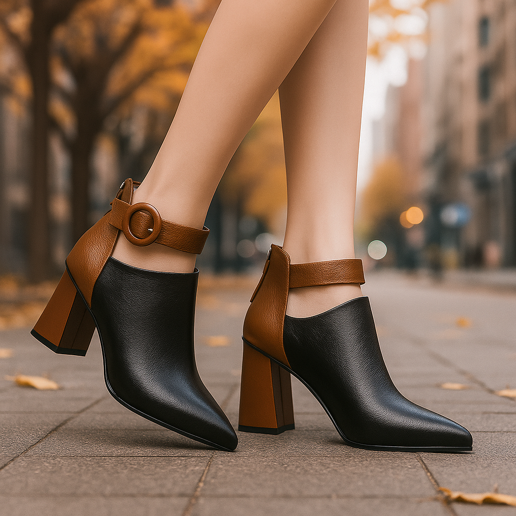 These bi-color heels merge sculpted leather, a bold buckle strap, and a solid block heel into a work of wearable art. With a cushioned insole and architectural lines, they walk the fine line between strength and sophistication, leaving an unmistakable trace of luxury in every step.